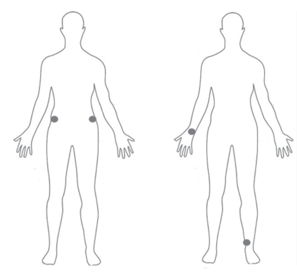 Option B: One pad on the inside of the right wrist and the other above the left ankle.